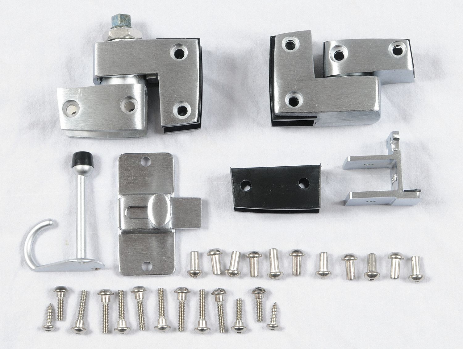 A complete selection of commercial restroom stall hardware and parts, .